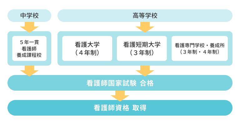 図のように、『看護師国家試験』は「看護大学」「看護専門3年制短大」「看護学校・養成所」などに通い卒業すると受験資格を得られます。3年制や4年制、夜間に学べる学校もありますので、働きながら資格取得を目指すことも可能です。